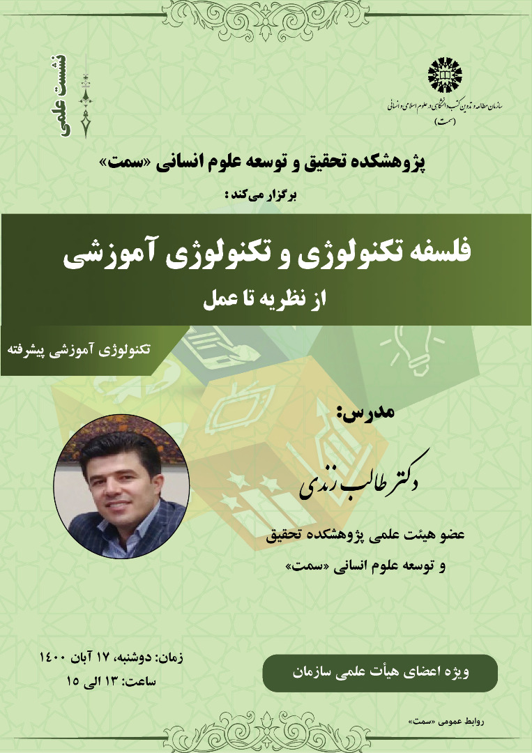 این نشست علمی به همت پژوهشکده تحقیق و توسعه علوم انسانی سازمان «سمت» شد و طالب زندی عضو هیأت علمی این پژوهشکده به تشریح و تدریس آخرین مباحث در حوزه تکنولوژی آموزشی پرداخت.
