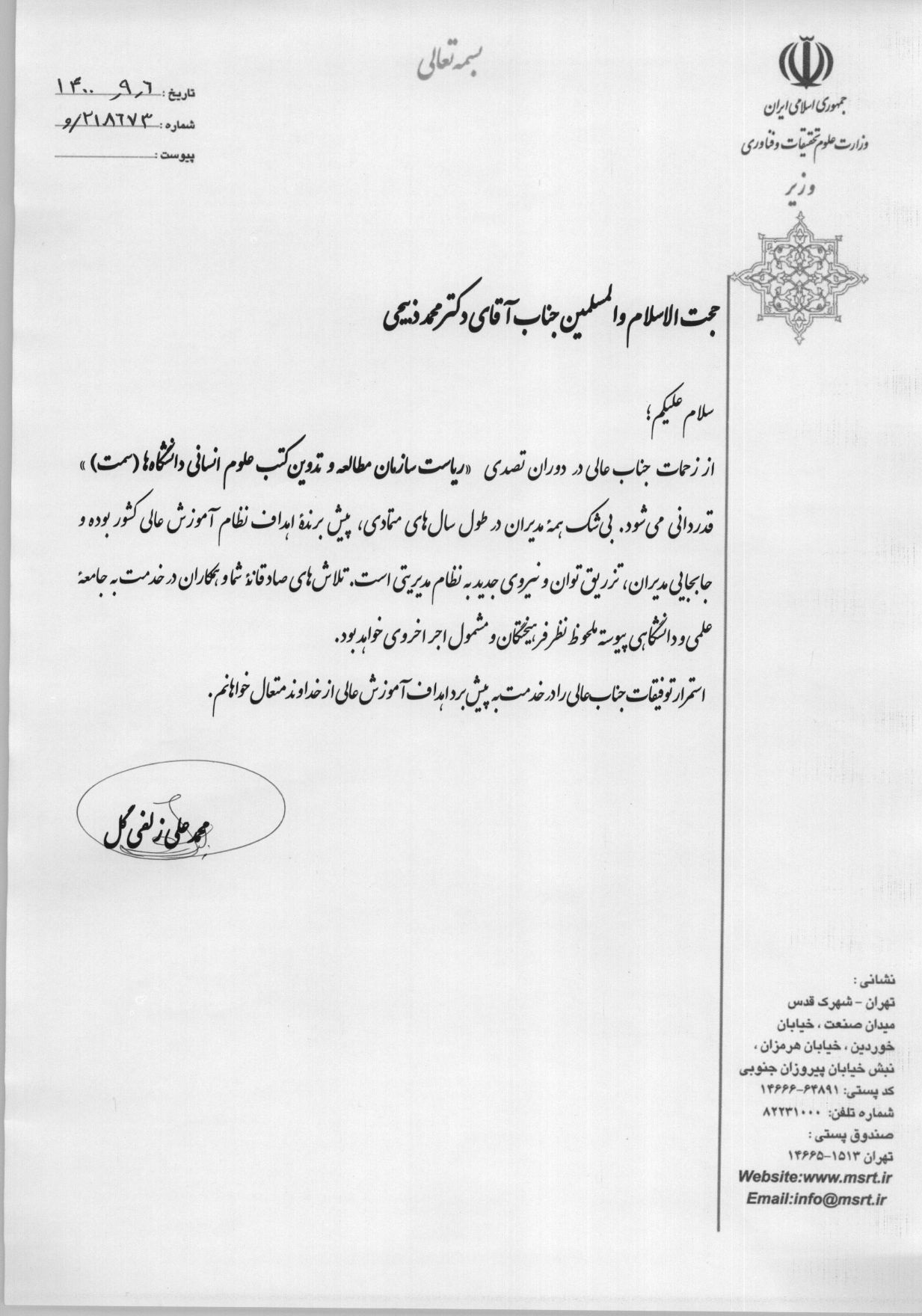 از زحمات جناب عالی در دوران تصدی«ریاست سازمان مطالعه و تدوین کتب علوم انسانی دانشگاه (سمت)» قدردانی می شود. بی‌شک همه مدیران در طول سال‌های متمادی، پیش برنده اهداف نظام آموزش عالی کشور بوده و جابجایی مدیران، تزریق توان و نیروی جدید به نظام مدیریتی است. تلاش‌های صادقانه شما و همکاران در خدمت به جامعه علمی و دانشگاهی پیوسته ملحوظ نظر فرهیختگان و مشمول اجر اخروی خواهد بود.
