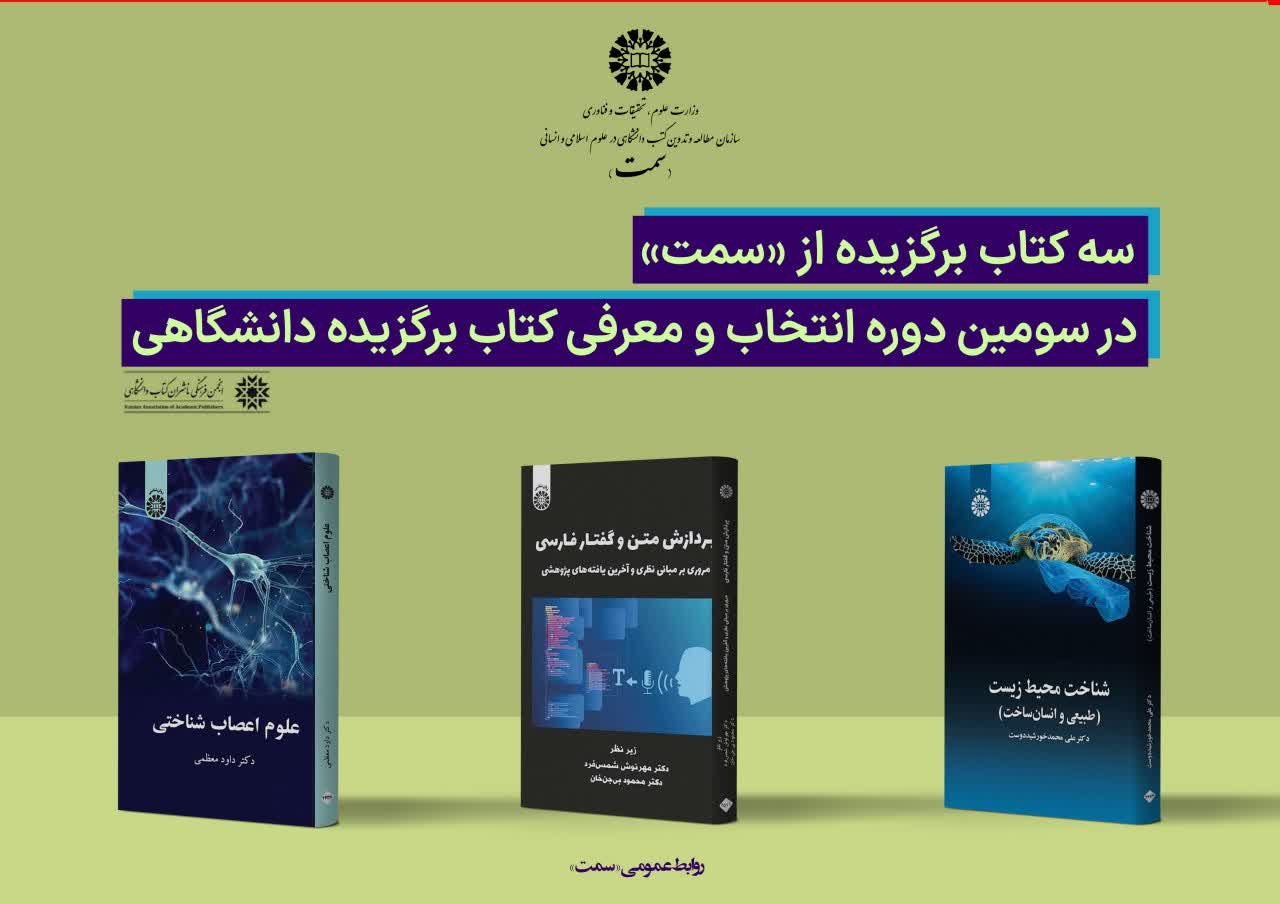 از مجموع هشت اثر برگزیده سه کتاب از جمله آثار منتشر شده از سوی »سمت» بود که عبارتند از: «علوم اعصاب شناختی» نوشته داود معظمی، «شناخت محیط زیست (طبیعی و انسان‌ساخت)» اثری از علی‌محمد خورشیددوست و «پردازش متن و گفتار فارسی - مروری بر مبانی نظری و آخرین یافته‌‌های پژوهشی» نوشته مهرنوش شمس‌فرد و محمود بی‌جن‌خان بودند.