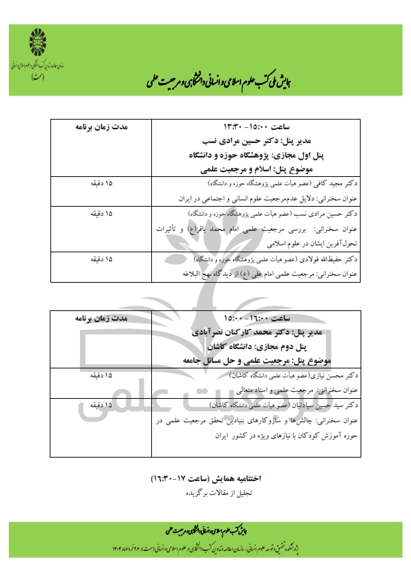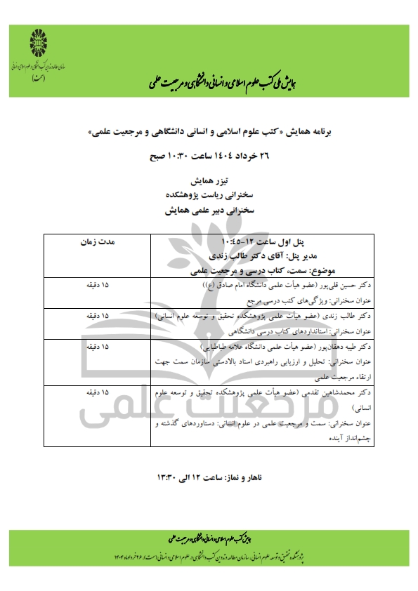به گزارش روابط عمومی «سمت»، بر اساس اعلام دبیرخانه همایش ملی «کتب علوم اسلامی و انسانی دانشگاهی و مرجعیت علمی»، دوشنبه ۲۶ خرداد در سالن همایشهای سازمان «سمت» برگزار خواهد شد. در این همایش یکروزه که در دو نوبت صبح و بعدازظهر برنامهریزی شده است، سخنرانان به ارائه یافتههای خود در زمینه مرجعیت علمی خواهند پرداخت. همزمان با رویداد حضوری، دو پنل به صورت مجازی ارائه سخنرانی خواهند داشت.