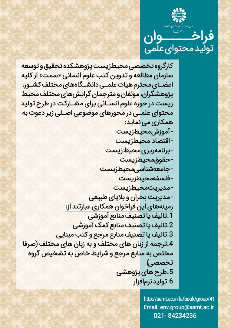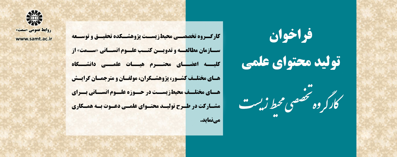 کارگروه تخصصی محیط‌زیست پژوهشکده تحقیق و توسعه سازمان مطالعه و تدوین کتب علوم انسانی «سمت»‌ از کلیه اعضای محترم هیات علمی دانشگاه‌های مختلف کشور، پژوهشگران، مولفان و مترجمان گرایش‌های مختلف محیط‌زیست در حوزه علوم انسانی برای مشارکت در طرح تولید محتوای علمی در محورهای اصلی زیر دعوت به همکاری می‌نماید: