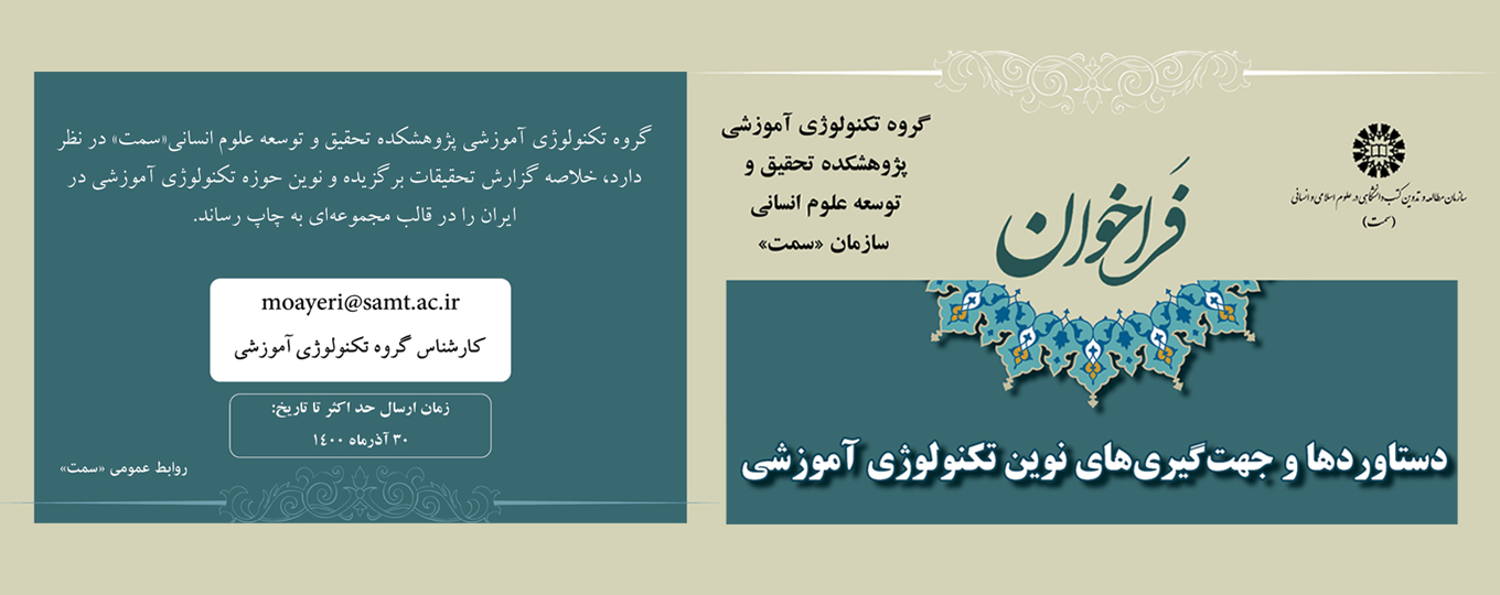 گروه تکنولوژی آموزشی پژوهشکده تحقیق و توسعه علوم انسانی«سمت» در نظر دارد، خلاصه گزارش تحقیقات برگزیده و نوین حوزه تکنولوژی آموزشی در ایران را در قالب مجموعه‌ای به چاپ رساند.